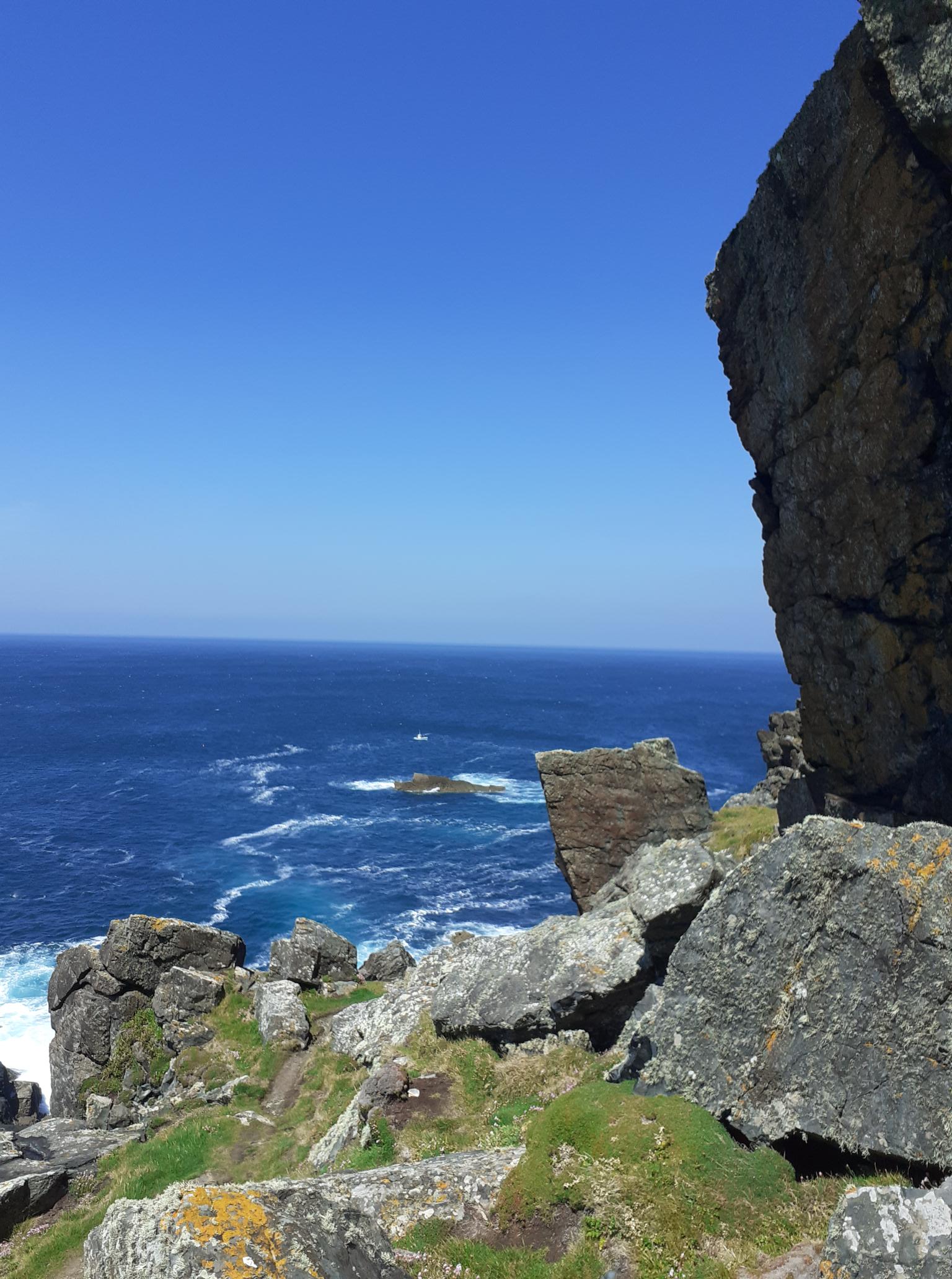 As we walk across the spine of rocks towards the view of The Carracks to the west, I call out, Watch out for adders! He knows what I am about to say. He waits, patiently: “Two adders curling round my ankles. Gorse, cowries, Cliffs, Choughs, Ravens, Cream, solitude, sublimity and all the rest of it” (90). I paraphrase the words written to her friend, but the two adders curling round her ankles, I recall verbatim. Later, in the same letter, she writes that “these queer fragments” of pendant humanity are worn like the “cryptic ornaments, serpents, you know, swallowing their tails in token of eternity” (91). With much sympathy, she writes: “I can’t see why it’s all wrong.”