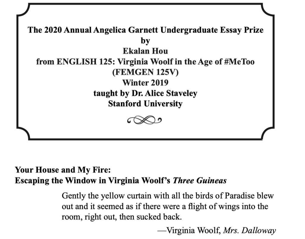 The International Virginia Woolf Society is pleased to host the Annual Undergraduate Essay Competition in honor of Virginia Woolf and in memory of Angelica Garnett, writer, artist, and daughter of Woolf’s sister, Vanessa Bell.