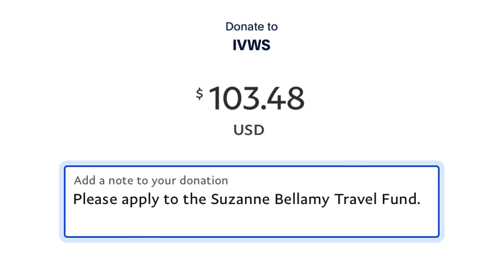 We take donations to the Suzanne Bellamy Travel Fund through PayPal. To donate, please click or tap the “Make a Donation” button below. On the PayPal donation site, type in the amount you wish to contribute, mark the accompanying box if you are willing to cover PayPal fees, click “Next,” and then add a note that marks it as a contribution to the “Suzanne Bellamy Travel Fund” before confirming your donation. (See image for an example of a note.)